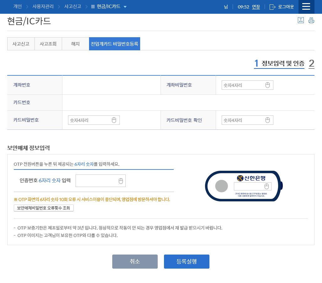 그러면 현금카드가 등록이 되게 됩니다.