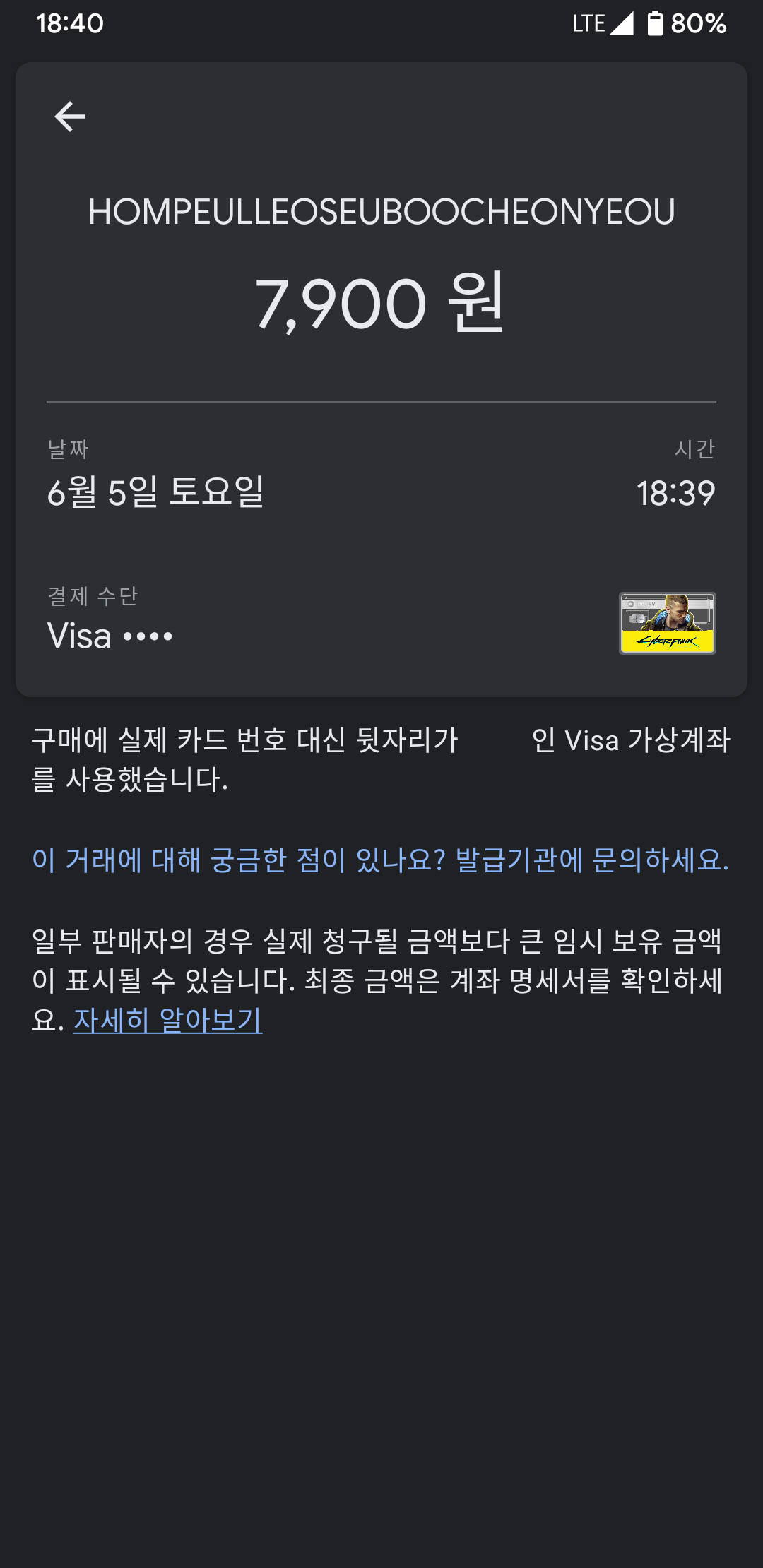 이건 구글페이에 등록할 때 가상카드번호로 등록되는 방식이라 그렇습니다.