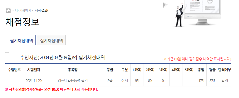 게다가 한국산업인력공단과 다르게 결과가 바로 안 나오고 다음날 10시 이후에나 나온다는 것도 좀 단점인 것 같습니다.