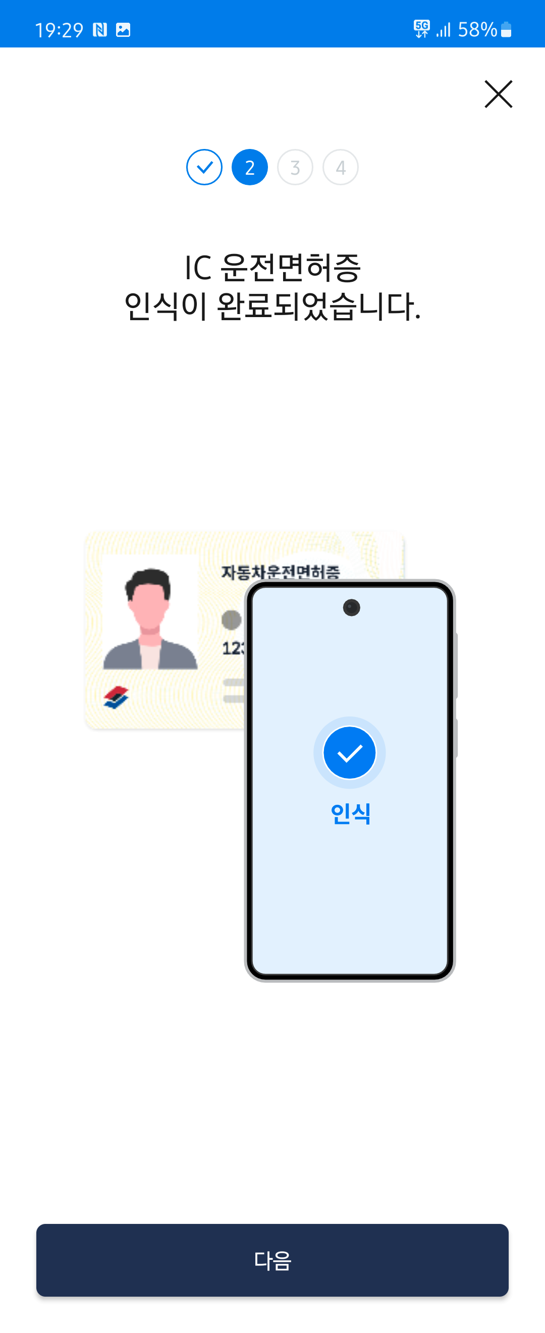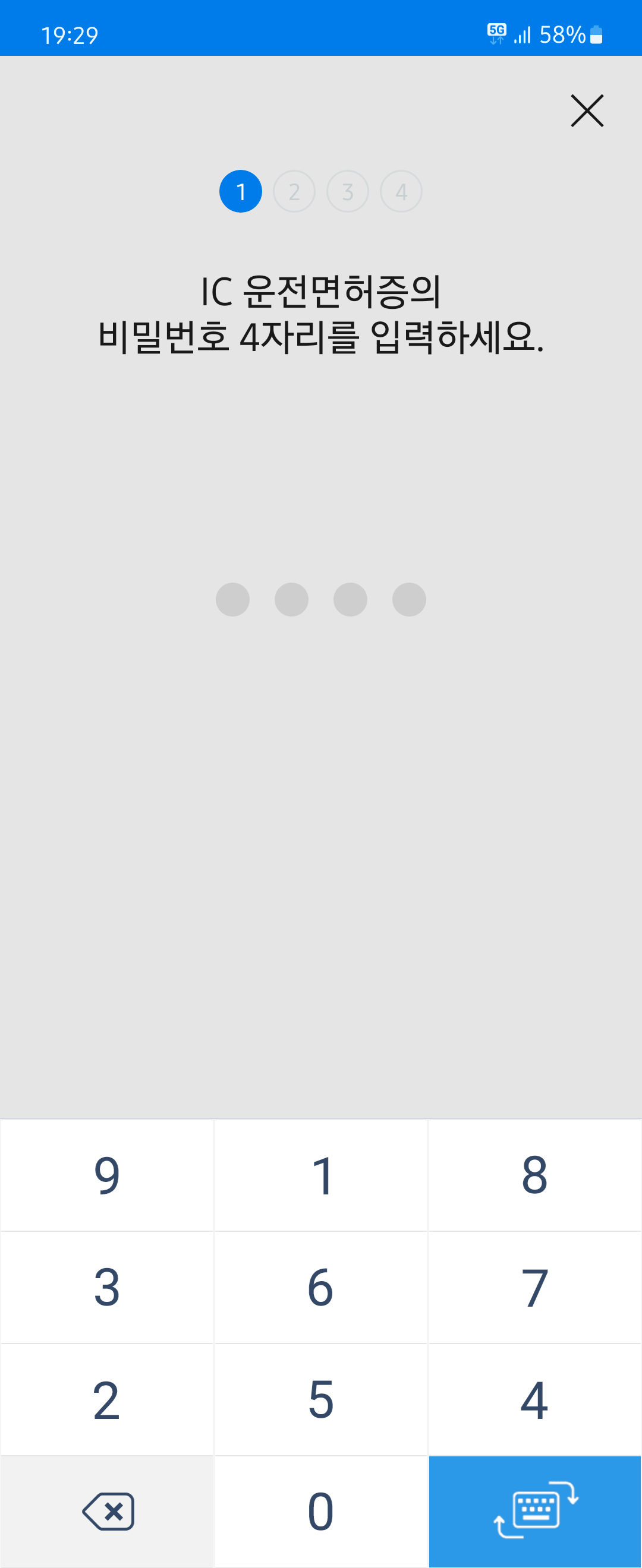 면허증 수령 시 등록했던 비밀번호 4자리를 입력하고, 휴대폰의 NFC 인식 위치에 맞춰서 면허증을 대면