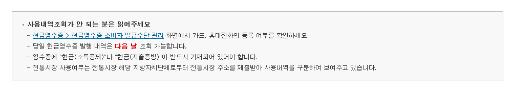'조회/발급' - '현금영수증 조회' - '사용내역(소득공제 조회)'를 누른 후