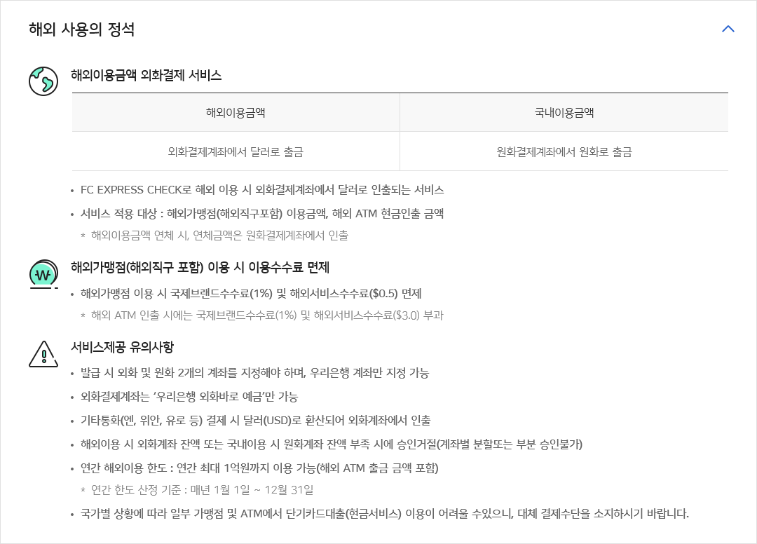 외화예금 연결 체크카드인 만큼 당연히 해외이용 혜택이 있는데요