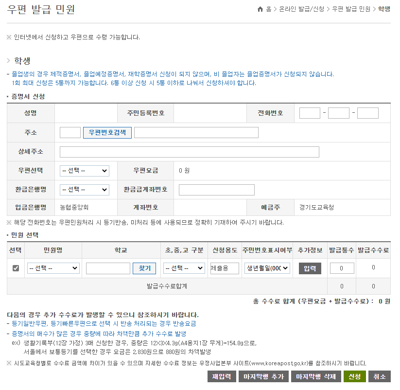 위쪽 증명서 신청 부분에 '우편선택'도 골라줘야 하는데요