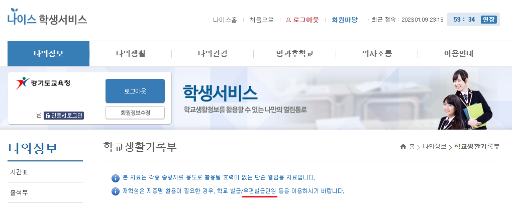 저걸 보니 나이스 학생서비스 학교생활기록부 페이지에