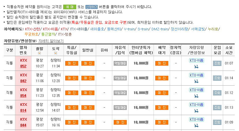 출도착역 날짜 시간을 설정하고 검색을 누르면 이렇게 결과가 나오는데