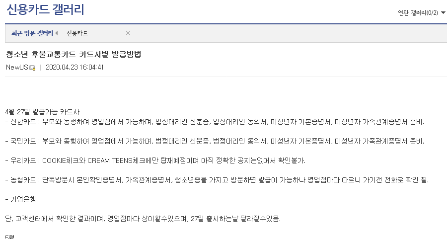 4월 27일에 모든 카드사에서 발급이 가능한게 아니라, 일부 카드사부터 발급을 진행한다고 합니다.