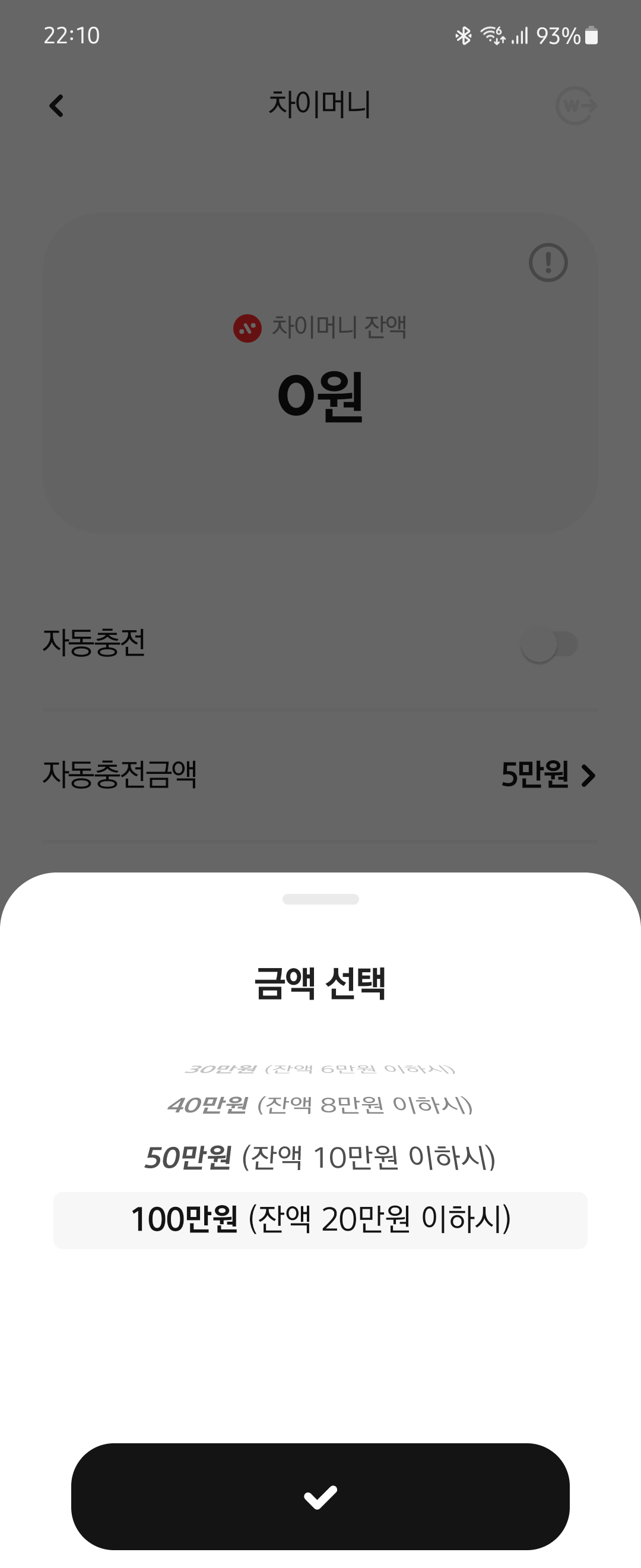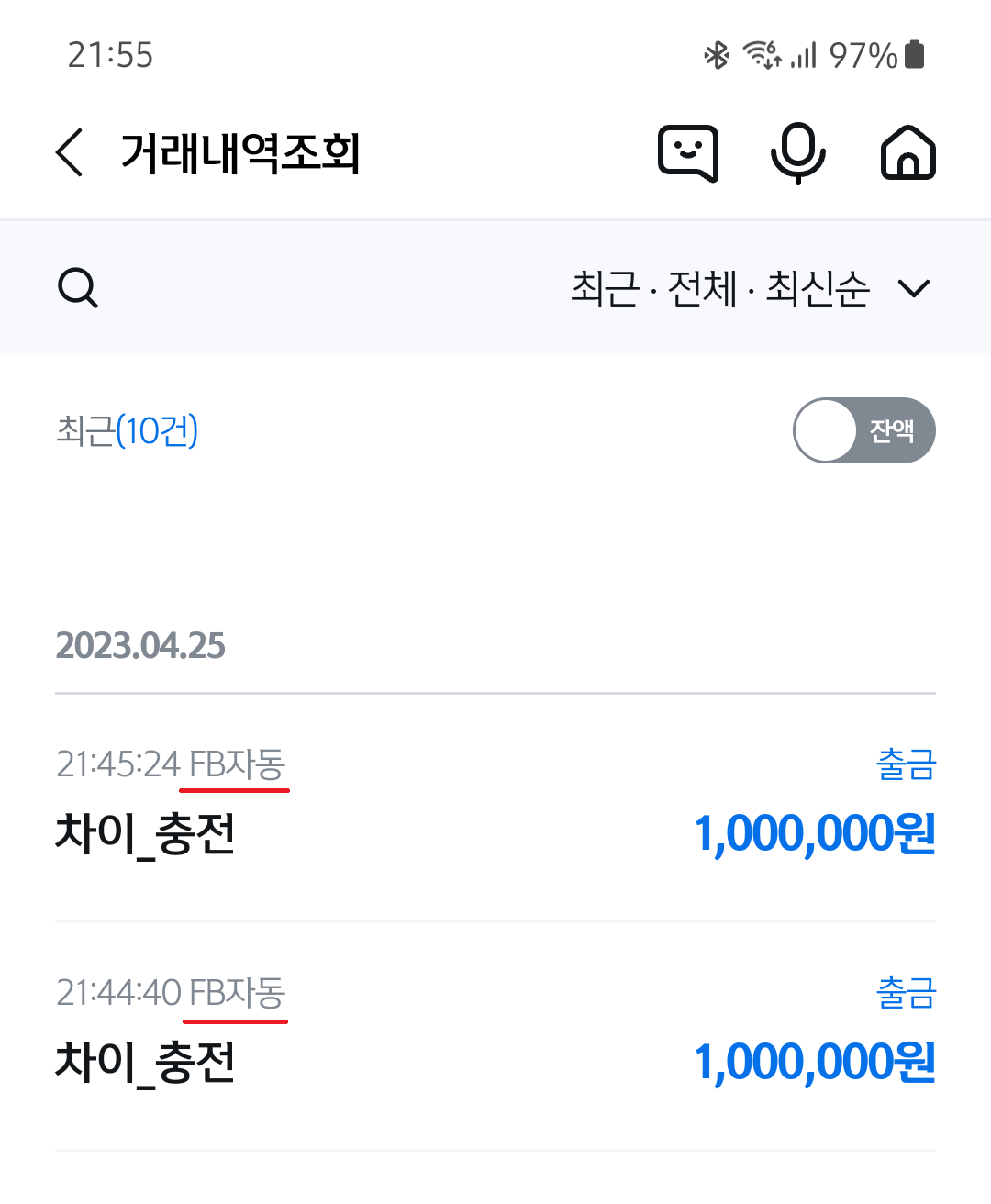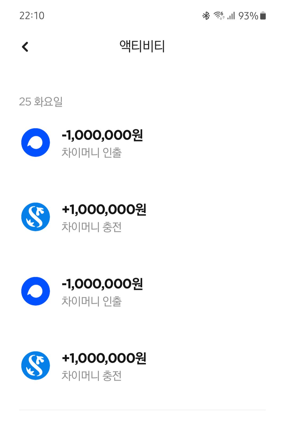 차이머니 잔액이 부족하면 '부족 금액만큼만' 등록된 계좌에서 출금되는 방식이었습니다