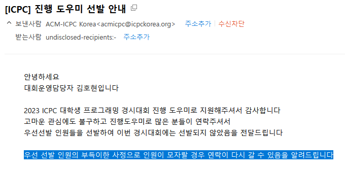 그렇게 해서 ICPC 진행 도우미에 추가선발이 되었고