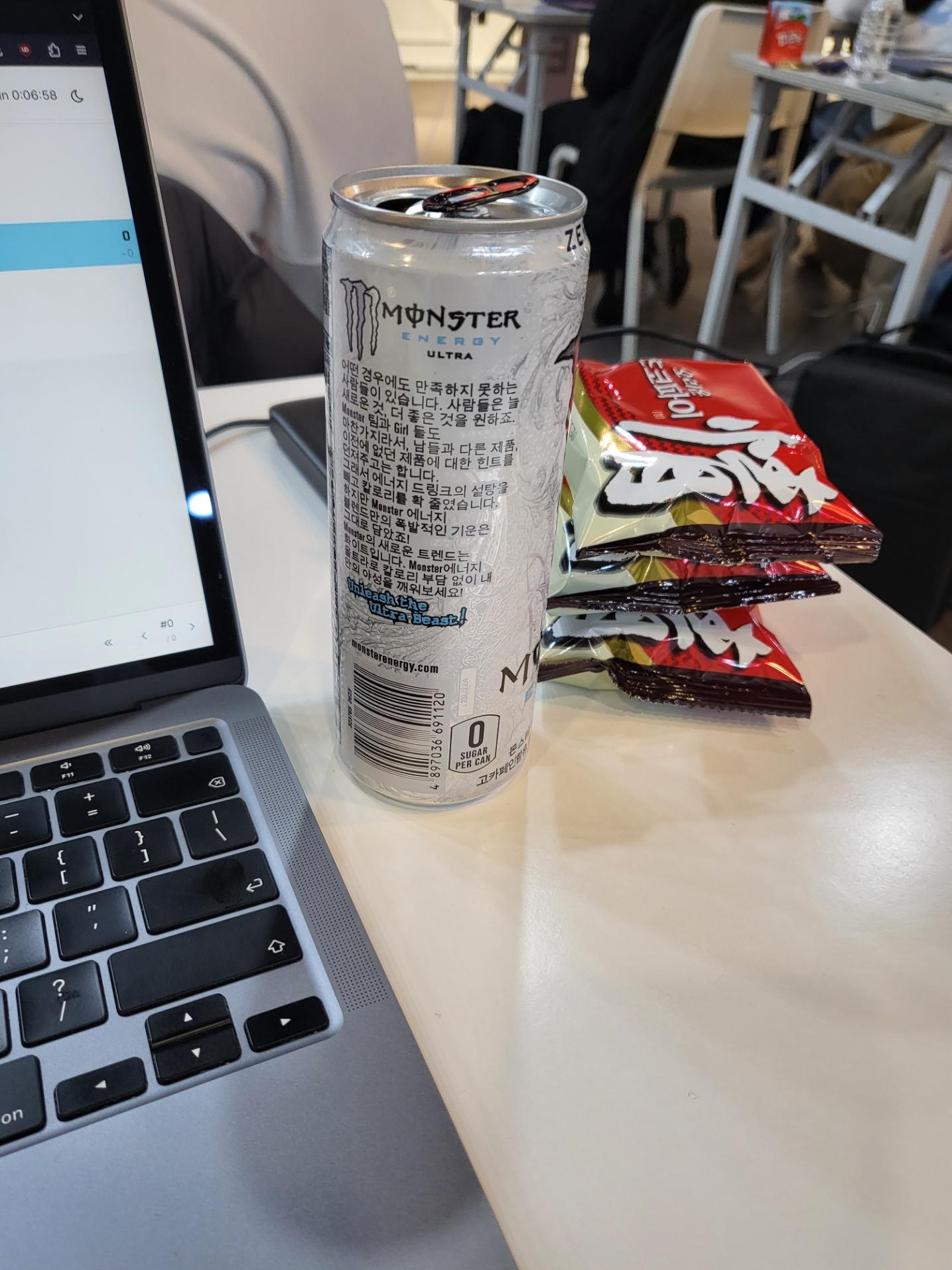 끝난 후에는 다과로 몬스터와 초코파이를 먹으면서 대회 시작을 기다렸습니다