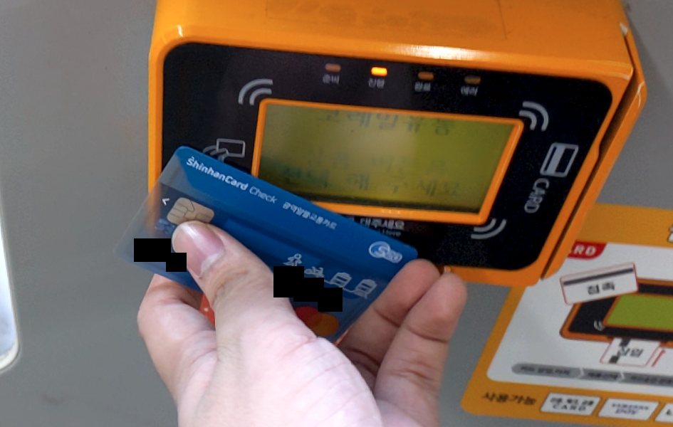 또한 카드 사용이 가능한 자판기에서도 인식합니다. 사진의 단말기의 경우는 승인 방식이라 결제시에 결제 문자가 옵니다. 무승인 방식 자판기는 어떻게 될지 모르겠네요. 나중에 발견하면 시도를 해봐야 겠네요.