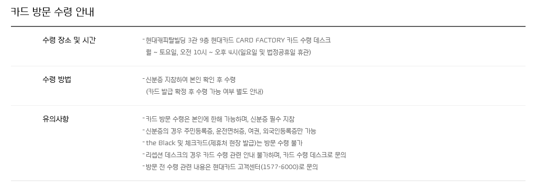 그 후 발급이 완료되면 여의도에 있는 현대카드 카드팩토리로 가서 받으면 됩니다.
