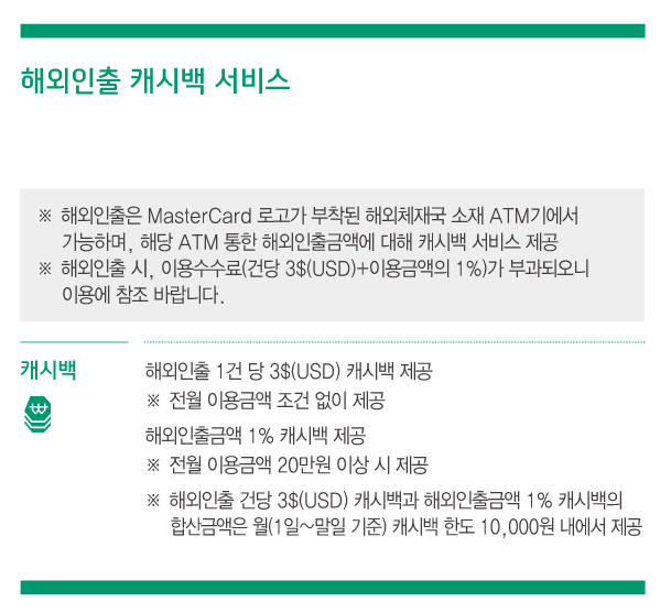 해외인출 캐시백도 있는데, 인출 수수료 3달러는 무실적 캐시백, 마스터카드 수수료 1%는 전월실적 20만원 이상일때 캐시백을 해줍니다. 다만 월 10,000원 한도라고 하네요.