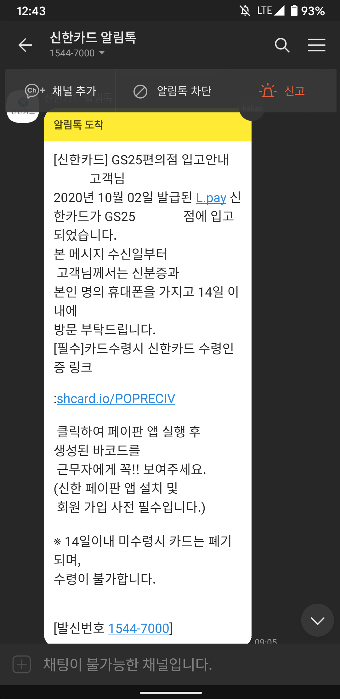 GS25 해당 점포에 카드가 도착하면 이렇게 카톡이 오게 됩니다.