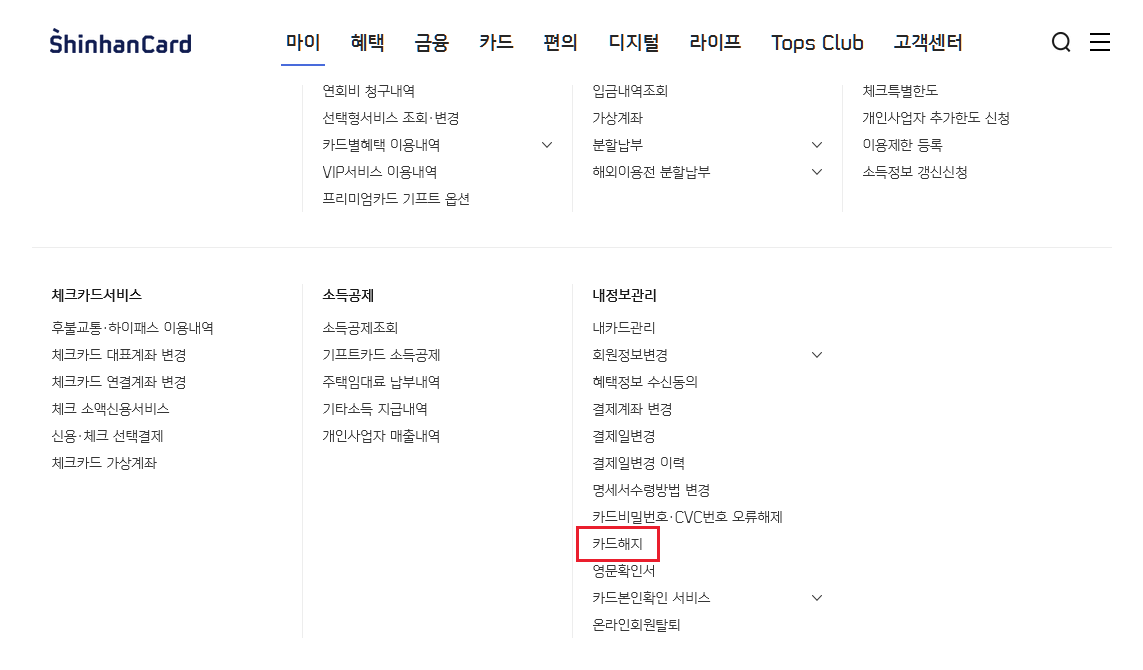 우선 로그인 후, 마이-내정보관리-카드해지 메뉴로 들어갑니다.