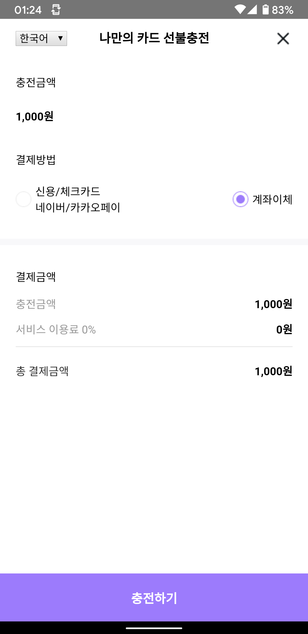 카드로 충전 시 수수료는 3%이고, 계좌이체는 어째선지 0%입니다.