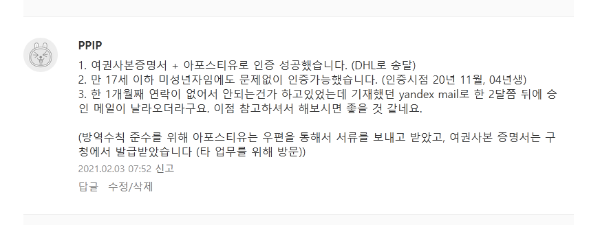 사실 제가 참고한 글에선 번역과 공증까지 했었지만, 러시아어 여권사본증명서로 가능했다는 댓글이 있더군요.