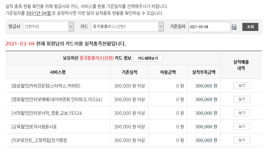 BC카드 보유 카드 목록을 통해서만 혜택이 나오는데, 정작 전월 실적이 안 나와있네요.