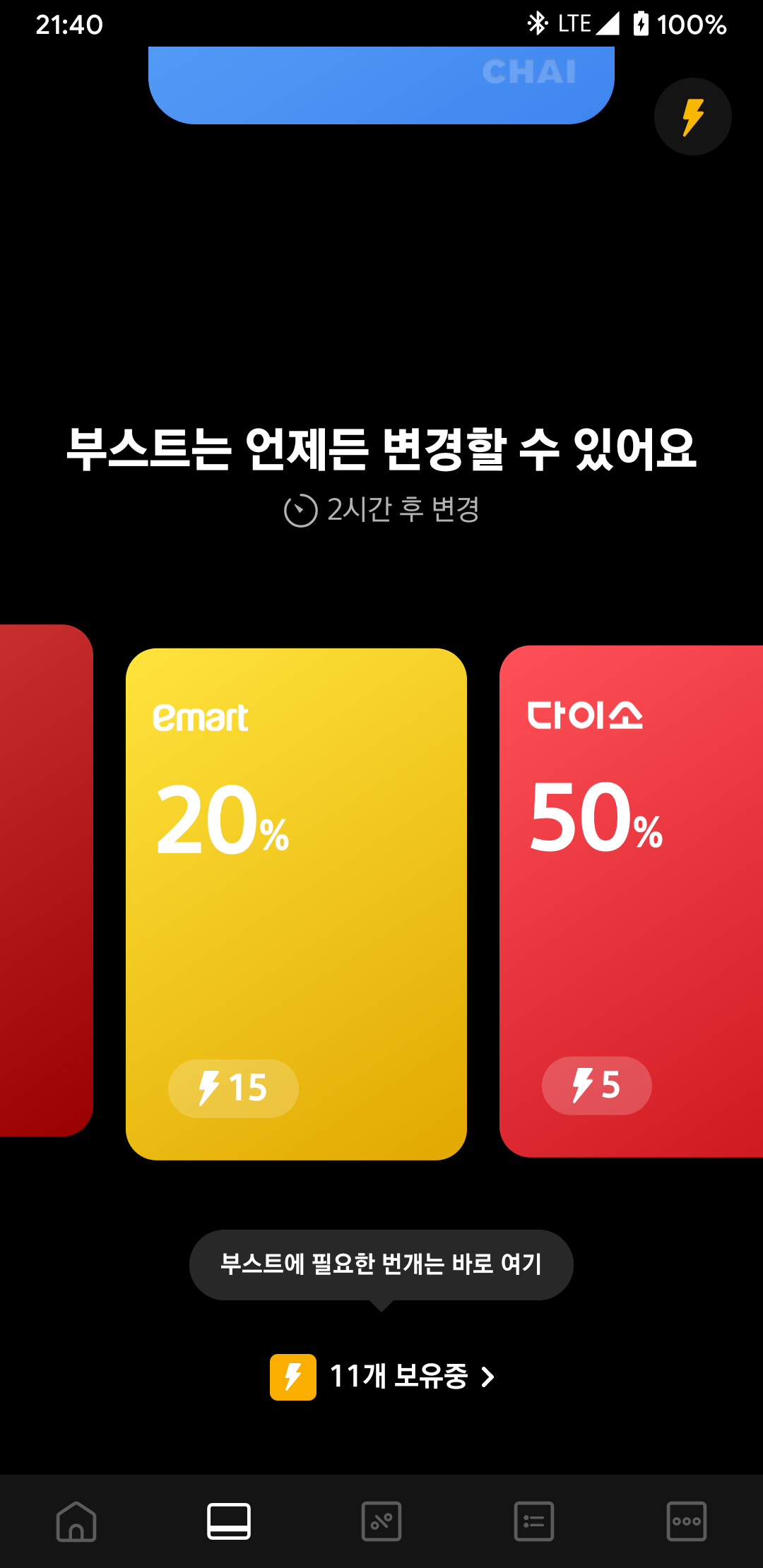 차이카드의 혜택은 번개를 모아서 선택해서 사용할 수 있습니다.