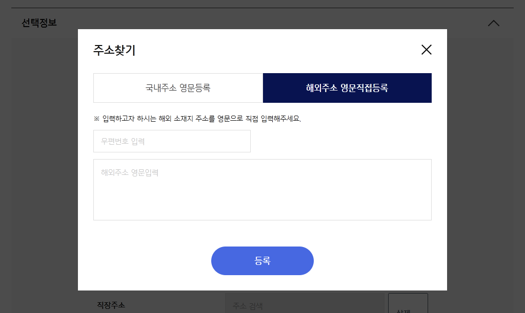 다만 해외 주소는 검색 그런 거 없으니 직접 적어야 합니다.